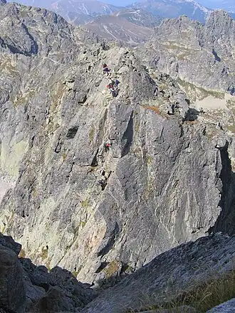 - ▬ Ein rot markierter Wanderweg führt vom Kasprowy Wierch über die Gipfel Beskid und Mittlerer Turm (Pośrednia Turnia) sowie die Bergpässe Liliensattel und Seealmsattel auf die Seealmspitze und weiter zum Höhenweg Orla Perć, der beim Bergpass Riegelscharte beginnt. Als Ausgangspunkt für eine Besteigung aus den Tälern eignen sich die Berghütten Schronisko PTTK Murowaniec sowie Schronisko PTTK w Dolinie Pięciu Stawów Polskich.