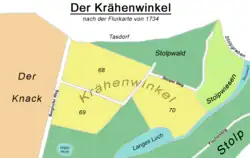 Der Krähenwinkel liegt zwischen dem Stolp im Osten und dem Knack im Westen. Im Süden wurde er einst von der Woltersdorfer Heide begrenzt.