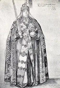 - ↑ Heinrich Pleticha: Des Reiches Glanz: Reichskleinodien und Kaiserkrönungen im Spiegel der deutschen Geschichte. Herder, Freiburg im Breisgau, Basel, Wien 1989, ISBN 3-451-21257-9, S. 232 f.