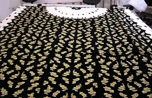 Ein Krönungs-, Fürsten- oder Königsmantel ist ein traditionelles, repräsentatives, meist ärmelloses Kleidungsstück von Staatsoberhäuptern. Fast immer gehörte eine Ausschmückung mit Hermelinfell dazu. Man sagte dem Hermelin solche „Reinigkeit“ nach, dass es „lieber durch Feuer laufet als in etwas unreines“. Diese Vorstellungen haben wohl bewirkt, dass Hermelinfell jahrhundertelang nur für die Kleidung allerhöchster Würdenträger verwendet werden durfte, obwohl es viele weit kostbarere Pelzarten gab und gibt. Hermelin gilt allgemein als Pelz der Kaiser und Könige.[2] In England proklamierte König Eduard III. etwa in der Mitte des 14. Jahrhunderts das Hermelin zum königlichen Pelz.[3] Charakteristisch für den Pelz als Standeszeichen sind die aufgesetzten Hermelinschweife mit ihren schwarzen Schwanzspitzen („getupftes“ Hermelin). Als heraldisches Pelzwerk erscheint das stilisierte Hermelin zudem als Rangzeichen beziehungsweise Herrschaftssymbol in den Wappen vieler Fürstenhäuser.