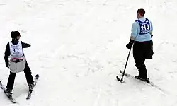 Monoskifahrer, Rollstuhlfahrer oder Doppeloberschenkel-Amputierte, verwenden kürzere Krückenskier zum Stabilisieren, fahren aber sitzend auf einem Monoski im Gegensatz zu Krückenskifahrern, die den Sport stehend betreiben.