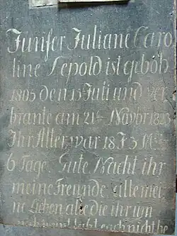 - ↑ Krügersdorfer Kirchenbuch (1822–1851), S. 154 [31. Oktober 1823]. Die Hölzerne Tafel nennt unerklärlicherweise den 31. November 1823 als Todestag.