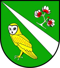 Blasonierung: „In Grün ein schmaler schrägrechter silberner Keil, unten eine silbern bewehrte hersehende goldene Schleiereule, oben ein dreiblütiges silbernes Pfaffenhütchen mit roten Blütenansätzen.“[8]