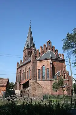 Die bis 1945 evangelische Kirche, ein Backsteingebäude im neugotischen Stil, ist im Jahre 1880 nach Entwürfen des Architekten Ludwig von Tiedemann errichtet worden.[5] Der Altar wurde von Holzbildhauer Gustav Kuntzsch, Wernigerode, geschaffen.[6] Die Orgelbauwerkstatt Gebrüder Dinse, Berlin, lieferte die Orgel (Manuale: II/P, Register: 13).[7]