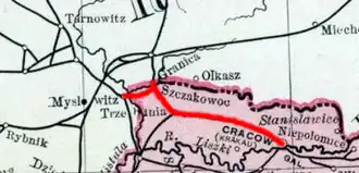 Die 67 Kilometer lange Hauptstrecke wurde am 13. Oktober 1847 eröffnet, ein Jahr nach der Angliederung des Großherzogtums Krakau in das österreichische Kronland Galizien. Sie führte von Krakau nach Myslowitz, einem Grenzort im Osten des preußischen Oberschlesien, der am 18. Oktober 1847 Anschluss an die Oberschlesische Eisenbahn bekam. Zwischen Krakau und der preußischen Grenze führte die Strecke durch Trzebinia und dann durch Szczakowa, das ganz nahe an der damaligen russischen Grenze lag. Im Folgejahr, am 1. April 1848 wurde nördlich dieser Grenze in nächster Nähe des Bahnhofs Szczakowa (heute Jaworzno Szczakowa) der Endbahnhof Granica (dt. Grenze) der Warschau-Wiener Eisenbahn eröffnet.