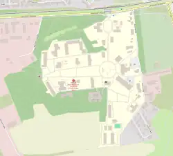 Der ursprüngliche Haupteingang an der Rostocker Chaussee war der Beginn der Nord-Süd-Achse. Es dominiert jedoch die Mittelachse, die in West-Ost-Richtung verläuft und auf die Klinikumskirche führt. An dieser, von Osten nach Westen leicht ansteigenden Achse, sind die Gebäude angeordnet; eine Lindenallee prägt diese Achse.