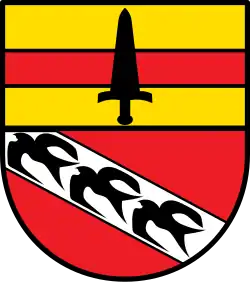 Blasonierung: „In geteiltem Schild oben ein roter Balken in Gold, belegt mit einem schwarzen Schwert, unten ein silberner Schrägbalken, belegt mit drei schwarzen Schwalben.“ |