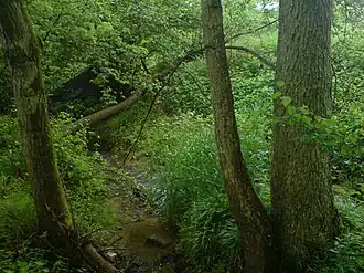 Der Kreßbach nahe bei Herbolzheim. Das Bild mit ausnahmsweise starkem Baumbewuchs ist nicht repräsentativ für den Gesamtverlauf. | ||