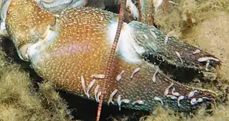 Branchiobdelliden an der Schere eines Signalkrebses (Pacifastacus leniusculus) | ||||||||||