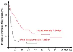 Wie eingangs gezeigt wurde, spielt das Immunsystem bei der Entstehung, beziehungsweise der Vermeidung, von Krebserkrankungen eine wichtige Rolle. Aber auch nachher, wenn durch einen Immun-Escape tatsächlich eine Krebserkrankung ausbricht, hat das Immunsystem einen großen Einfluss auf den Krankheitsverlauf. Dies zeigt sich unter anderem daran, dass die Aktivität des Immunsystems gegenüber Krebszellen ein wichtiger Faktor für die Prognose bei Krebspatienten ist.[26] So konnte beispielsweise gezeigt werden, dass die zellvermittelte Immunogenität gegenüber tumorassoziierten Antigenen (TAA) ein besserer Indikator für die Überlebensrate ist als Staging, Grading und Status der Lymphknoten.[27] Bei Patientinnen mit Brustkrebs in einem frühen Stadium ist die Überlebensrate deutlich höher, wenn sie eine natürliche humorale Immunantwort gegen epitheliales Mucin-1 der Tumorzellen zeigen.[28][29] 2003 wurden in einer Studie über 100 Ovarialkarzinome immunhistologisch untersucht. Dabei konnte eine signifikante Korrelation zwischen dem progressionsfreien Überleben bzw. dem Gesamtüberleben und der Infiltration des Tumorgewebes mit T-Zellen (TIL = tumor infiltrating lymphocytes) festgestellt werden. Die Fünf-Jahres-Überlebensrate betrug bei den Patientinnen mit T-Zell-infiltrierten Tumoren 38 %, während sie bei Patientinnen ohne T-Zellen im Tumor bei lediglich 4,5 % lag.[25] Ähnliche Korrelationen wurden beispielsweise für das maligne Melanom,[30][31] Blasenkrebs,[32] kolorektales Karzinom,[33][34] Prostata,[35] Mastdarmkrebs[36] und Neuroblastom[37] festgestellt.[11]