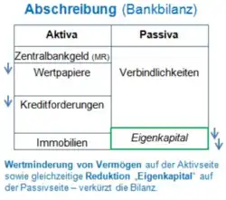 „Da regulatorisch von den Basel-I/II-Regeln 8% Eigenkapitalquote als Minimum für die Banken vorgeschrieben war, bedeuten Verluste bei Banken ein Sinken des Eigenkapitals im Bankensektor und mithin verschlechterte Aussichten für eine Kreditvergabe an Unternehmen und private Haushalte.“ - ↑ Joachim von Köppen, Das Eigenkapital der Kreditinstitute, 1966, S. 203