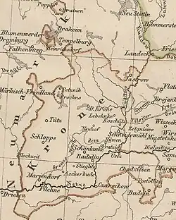 Der Kreis Deutsch Krone war seit 1772 einer der vier Kreise des Netzedistrikts, der durch die erste polnische Teilung 1772 zu Preußen gekommen war.[1] Durch den Tilsiter Frieden fiel 1807 der Südteil des Kreises mit den Städten Filehne, Schönlanke und Schneidemühl an das Herzogtum Warschau.