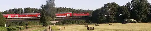 Links: RegionalExpress auf der Rurbrücke zwischen Baal und Brachelen, Rechts: Erntezeit