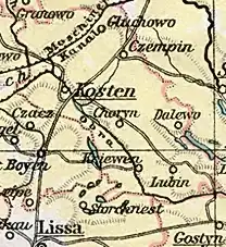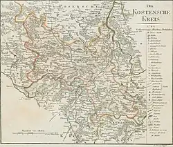 Das Gebiet um die großpolnische Stadt Kosten gehörte nach der Zweiten Teilung Polens von 1793 bis 1807 zum Kreis Kosten in der preußischen Provinz Südpreußen.[2] Durch den Frieden von Tilsit kam das Gebiet 1807 zum Herzogtum Warschau. Nach dem Wiener Kongress fiel es am 15. Mai 1815 erneut an das Königreich Preußen und wurde Teil des Regierungsbezirks Posen der Provinz Posen.