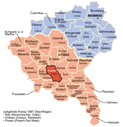 Der Kreis Kosten hatte bis zur Teilung im Jahre 1887 eine Fläche von 1162 km², danach 608 km².[1]