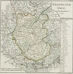 Bei den preußischen Verwaltungsreformen wurde zum 1. Januar 1818 im Regierungsbezirk Posen eine Kreisreform durchgeführt, bei der die Abgrenzung des Kreises Kröben nur geringfügig geändert wurde.[3] Kreisstadt und Sitz des Landratsamtes wurde die Stadt Rawitsch.
