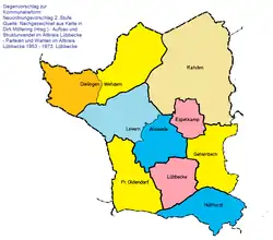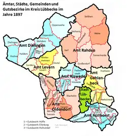 Im Rahmen der Einführung der Landgemeinde-Ordnung für die Provinz Westfalen wurde 1843 der Kreis in elf Ämter eingeteilt.[4] Die Stadt Lübbecke blieb amtsfrei. Bei der Einrichtung der Ämter orientierte man sich an den bestehenden Verwaltungsbezirken und Kirchspielen. Gleichzeitig erhielten alle Orte, die für ihre Kommunalbedürfnisse einen eigenen Haushalt führten, den Status einer (Land-)Gemeinde.[5] Orte im Kreis Lübbecke, die in diesem Zusammenhang keinen Gemeindestatus erhielten, sondern größeren Gemeinden zugeordnet wurden, waren unter anderem Eininghausen, Heddinghausen, Obermehnen und Stockhausen. Neben den Gemeinden wurden im Kreis Lübbecke auch fünf Gutsbezirke eingerichtet. Zum 1. Januar 1849 wurde Sielhorst von Varl abgetrennt und bildete eine weitere Gemeinde im Amt Rahden.[6] 1850 gliederte sich der Kreis Lübbecke in die amtsfreie Stadt Lübbecke sowie 44 amtsangehörige Gemeinden und fünf Gutsbezirke in elf Ämtern.