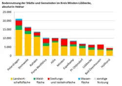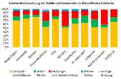 Der Anteil der landwirtschaftlichen Nutzfläche liegt mit 65,7 % deutlich über dem Landesdurchschnitt (49,2 %) und ist auch der höchste Wert aller Landkreise des Regierungsbezirkes Detmold (Durchschnitt OWL: 57,3 %). Auf kommunaler Ebene schwankt dieser Wert zwischen Bad Oeynhausen (rund 30 %) und der Stadt Rahden (über 80 %). Letztere Kommune weist den größten Anteil landwirtschaftlicher Nutzfläche in Ostwestfalen-Lippe überhaupt auf.