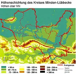 - Das Norddeutsche Tiefland mit der Wesertalung: Hier treten beider relativ niedrigen Höhenlage höhere Durchschnittstemperaturen auf, im Durchschnitt mit Jahresmittelwerten bis zu 9,3 °C im äußersten Norden. Am 20. August 2009 wurde an der Wetterstation in Rahden-Varl mit 37,8 °C die höchste Temperatur Deutschlands des Jahres 2009 erreicht.[11] Besonders warm sind die geschützten Lagen in der Wesertalung und die relativ niedrig gelegenen Gegenden im Norden des Kreisgebietes. Diese zählen neben der Warburger Börde zu den niederschlagsärmsten Gegenden Ostwestfalen-Lippes. Im äußersten Norden bei Rahden liegt die jährliche durchschnittliche Niederschlagsmenge bei etwa 630–700 mm.