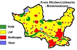 Ein großer Anteil des Kreisgebietes wird landwirtschaftlich genutzt. Jedes fünfte Rind und jedes vierte Schwein des Regierungsbezirks Detmold werden im Kreis Minden-Lübbecke gehalten, obwohl dieser nur rund 17,6 Prozent der Fläche des Regierungsbezirks ausmacht.[41]