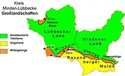 Naturräumlich hat das Kreisgebiet Anteil am Norddeutschen Tiefland und den Mittelgebirgen. Das Tiefland im Norden des Kreises nimmt rund 4/5 der Kreisfläche ein. Naturräumlich wird es im Kreisgebiet in die Wesertalung im Osten, die Rahden-Diepenauer Geest im Westen und Nordwesten sowie die Diepholzer Moorniederung im Norden untergliedert. Diese drei Naturräume zählen zur Dümmer-Geestniederung.