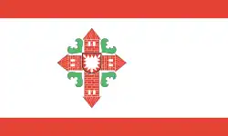 Die Kreisflagge zeigt inmitten eines weißen, oben und unten von einem roten Streifen begrenzten Tuches das Kreiswappen ohne Schild, etwas zur Stange hin verschoben.[28]