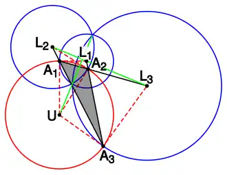 - Die drei Kreise des Apollonios (blau) eines Dreiecks (grau) schneiden sich im isodynamischen Punkt des entsprechenden Dreiecks. Ihre Mittelpunkte liegen auf einer Geraden (grün) und sie schneiden den Umkreis (rot) des Dreiecks senkrecht.[3]