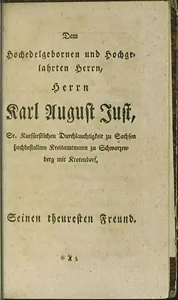 - ↑ Christian Heinrich Hecht widmete Just seine Geschichte des kursächsischen Bergfleckens Sosa im Meisnischen Obererzgebirge, Hof und Leipzig 1778, S. A2 (Digitalisat in der Staats- und Universitätsbibliothek Dresden)