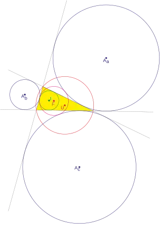 Ganz ähnlich definiert wie der Inkreis sind die drei Ankreise, die jeweils das Innere einer Dreiecksseite und die Verlängerungen der beiden anderen Seiten berühren. Ihre Mittelpunkte ergeben sich dadurch, dass man jeweils die Winkelhalbierende eines Innenwinkels mit den Winkelhalbierenden der nicht anliegenden Außenwinkel schneidet.