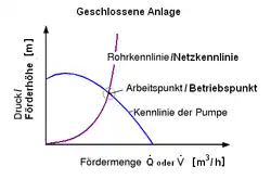 Die Kennlinie einer Kreiselpumpe beschreibt den Zusammenhang zwischen Druckerhöhung und Fördermenge (siehe Grafik rechts, blaue Kurve). Der höchste Druck wird bei einer Kreiselpumpe bei Fördermenge Null erzeugt. Das ist dann der Fall, wenn die Pumpe gegen einen geschlossenen Schieber fördert. Kombiniert mit der Kennlinie des angeschlossenen Rohrnetzes ergibt sich der Arbeitspunkt als Schnittpunkt von Pumpen- und Rohrnetzkennlinie. Durch Hintereinanderschaltung mehrerer Kreiselpumpen addiert sich der Förderdruck, durch Parallelschaltung die erzielbare Fördermenge. Drehzahländerungen der Pumpen verändern sowohl die Fördermenge als auch den Druck und damit die Leistungsaufnahme. Affinitätsgesetze: Q~n; H~n²; P~n³.