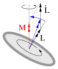 Der Drallsatz ist das wichtigste physikalische Gesetz in der Kreiseltheorie und schlägt sich anschaulich in der Regel vom gleichsinnigen Parallelismus[36] nieder, siehe Abbildung 6 dazu: Greift am Kreisel ein Drehmoment M an, dann versucht der Kreisel seine Drehbewegung, ausgedrückt durch den Drehimpuls L, dem Drehsinn des Moments gleichsinnig parallel auszurichten, was im Bild blau angedeutet ist.