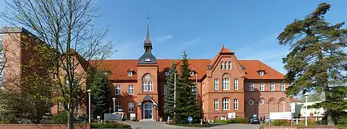 Das zweigeschossige, verklinkerte, historisierende damals städtische Krankenhaus mit den zwei seitlichen Giebelrisaliten und dem mittigen Türmchen über dem Portal mit einem Glockenhelm, einer Laterne und der Zwiebelspitze stammt von 1900. Es hatte 56 Betten. Es folgten 1922 An- und Umbauten.