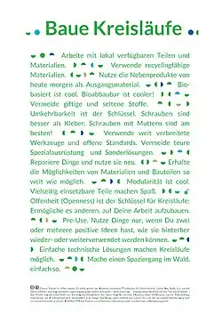 - Gestaltung ohne Abfall: Produkte werden so entworfen, dass Abfall vermieden wird und Materialien entweder biologisch abbaubar oder technisch wiederverwertbar sind.[2]