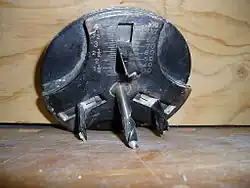 - Die Schneiden anderer Kreisschneider sind an einer Scheibe befestigt und bestehen aus je einer Vor- und einer Hauptschneide, die etwas zurückgesetzt ist. Die keilförmige Vorschneide schneidet den Rand der Bohrung, während die Hauptschneide das Material ausräumt. Ein Zentrierbohrer in der Mitte der Scheibe führt den Kreisschneider. Modelle für stationäre Bohrmaschinen kommen auch ohne Zentrierbohrer aus. Mittels Distanzscheiben wird der gewünschte Lochdurchmesser an der Messerscheibe eingestellt. Einige Ausführungen können an eine Span- und Staubabsaugung angeschlossen werden. eine Haube aus transparentem Kunststoff bietet Schutz gegen Staub beim Arbeiten im Decken-, Wand- und Bodenbereich.[3][4]