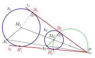Eine Alternative zur obigen (mit dem Hilfskreis, grün: Differenz der Radien der gegebenen Kreise) ist die folgende, weniger bekannte Konstruktion, die das äußere Ähnlichkeitszentrum P der beiden Kreise benutzt.[2] Die Konstruktion der zwei gemeinsamen äußeren Kreistangenten erfolgt in fünf Hauptschritten.