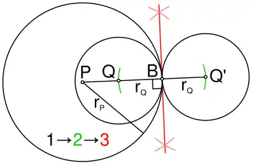 Um den Schnittpunkt A von ☉P mit der Strecke PQ wird ein Kreis mit Radius rQ geschlagen, der PQ zwischen A und Q in B schneidet (lindgrün). Der Abstand von B zu P ist somit gleich der Summe der Radien der gegebenen Kreise. Um P wird ein Kreis durch B geschlagen und mit dem Thaleskreis in G zum Schnitt gebracht (grün).