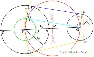 Um einen Schnittpunkt A von ☉P mit der Zentrallinie wird ein Kreis mit Radius rQ geschlagen, der die Zentrallinie zwischen A und P in B schneidet (lindgrün). Der Abstand von B zu P ist somit gleich der Differenz der Radien der gegebenen Kreise. Um P wird ein Kreis durch B geschlagen und mit dem Thaleskreis in G zum Schnitt gebracht (grün).