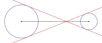 Zwei Kreise haben höchstens vier gemeinsame Tangenten, die beide Kreise zugleich berühren. Die Tangenten schneiden sich in den Ähnlichkeitspunkten der Kreise, von denen aus sie als zentrische Streckung voneinander erscheinen. Die inneren Tangenten gehen durch einen Punkt, der zwischen den Mittelpunkten der Kreise liegt, und die äußeren Tangenten treffen sich jedenfalls nicht zwischen den Kreisen. Es gibt