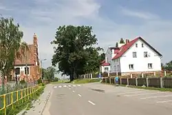 Die römisch-katholische Kirche Hl. Kreuz und St. Laurentius wurde ohne Chor in der Mitte des 14. Jahrhunderts errichtet und im Laufe der Jahre mehrfach umgebaut.[2] 1414 brannte sie aus, konnte aber Mitte des 15. Jahrhunderts wieder hergestellt und erweitert werden. Im 16. Jahrhundert dürfte sie wieder erheblich zerstört worden sein, so dass der ermländische Bischof Martin Cromer sie 1582 erneut weihte. Die Kirche erhielt 1715 ein neues Dach und 1719 einen neuen Innenanstrich.
