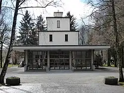 Das Grazer Krematorium mit Urnenfriedhof schließt nördlich an den Grazer Zentralfriedhof an und wurde zwischen 1931 und 1932 nach Plänen des Architekten Erich Boltenstern[12] im Auftrag des Feuerbestattungsvereines „Die Flamme“[13] errichtet. |