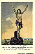 „In der Schlacht von SAARBURG, 20. August 1914, wurde dieses Christusbild wunderbarerweise erhalten, während der Kreuzesstamm weggeschossen wurde. Ich bin die Auferstehung und das Leben. Joh. 11, 25“
