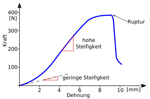 Bei geringer Belastung (= Kraft). verläuft die Kurve flach, da das Band ohne Zunahme der intraligamentären Kraft gedehnt wird (geringe Steifigkeit). Bei erhöhter Belastung nimmt die Steifigkeit des Bandes zu. Es stellt sich zunächst ein weitgehend linearer Anstieg ein (hohe Steifigkeit). In diesem Bereich verhalten sich die Kollagenfaserbündel des Bandes elastisch, da sie parallel ausgerichtet sind. Bei einer weiteren Krafteinwirkung finden irreversible Veränderungen im Band statt, so dass es nicht mehr zu seiner ursprünglichen Länge relaxieren kann. Nimmt die Kraft noch weiter zu, so zerreißen einzelne Faserbündel (die Kurve wird flacher). Da nicht alle Faserbündel der gleichen hohen Belastung ausgesetzt sind, kann selbst nach den ersten Rissen die Belastung weiter zunehmen (die Steifigkeit nimmt wieder ab). Ab einer bestimmten Maximalkraft zerreißt das Band schlagartig, was in einem plötzlichen Abfall der Kurve zu sehen ist.[7]