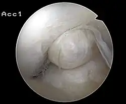 Die höchste diagnostische Sicherheit bietet die diagnostische Arthroskopie (Gelenkspiegelung). Dieses Verfahren stellt für die Diagnosestellung des Kreuzbandrisses den Goldstandard dar. Das Verfahren ist zwar minimalinvasiv, stellt aber in jedem Fall einen mit gewissen Risiken behafteten chirurgischen Eingriff in das Knie des Patienten dar.[94] Da jedoch die operative Behandlung eines Kreuzbandrisses in der Regel arthroskopisch (therapeutische Arthroskopie) durchgeführt wird, ergibt sich die Möglichkeit die Therapie, beispielsweise in Form einer Kreuzbandteilresektion (bei Anriss) oder einer Refixation des ausgerissenen Bandes, unmittelbar nach der diagnostischen Arthroskopie durchzuführen. Mit der zunehmenden Verbreitung von Kernspintomographen hat die Anzahl der rein diagnostischen Arthroskopien in den letzten Jahren deutlich abgenommen.[95][96] Die diagnostische Arthroskopie ist aber nach wie vor zur sicheren Abklärung der Diagnose einer Kreuzbandruptur – bei unklarer klinischer Befundung und unklarer MRT – das Mittel der Wahl.[94]