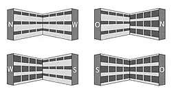 Wenn es das jeweilige Grundstück erlaubte, wurde der Kreuzbau immer unter maximaler Nutzung des Sonnenlichtes aufgestellt: Die Hauptfensterwand von Ost- und Westflügel weist nach Süden, während sie bei Nord- und Südflügel nach Osten weist. Somit ergibt sich bei Ansicht zweier Flügel eine charakteristische Abfolge von Haupt- und Nebenfensterwand, aus der sich die Himmelsrichtung des jeweiligen Flügels ergibt.