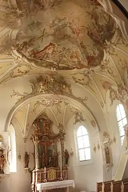 Der Innenraum des Langhauses ist mit einem Stichkappengewölbe überspannt, der der Apsis mit einer Apsiskalotte. Den Stuck hat Tassilo Zöpf eingebracht, die Fresken von 1771/72 stammen von Matthäus Günther. Das Deckenfresko stellt das Martyrium der sieben Benediktinermönche dar und zeigt die heilige Kaiserin Helena bei der Kreuzauffindung.[2]