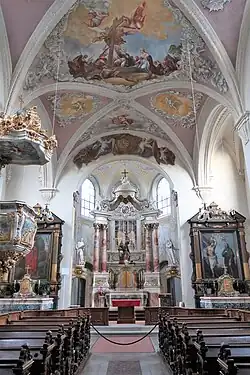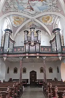 Im Zuge einer grundlegenden Kirchenrestaurierung 1714 schafften die Mönche aus eigenen Mitteln eine Orgel an, die vor der Westwand aufgestellt wurde.[9] Aus den Akten der 1802 aufgehobenen Bonner Klöster und Konvente geht hervor, dass diese Orgel 1780 einer grundlegenden Instandsetzung unterzogen wurde, 20 Register hatte und bei der Säkularisierung noch in „ziemlich gutem Zustand“ war. 1805 befand sie sich nicht mehr in der Kirche.