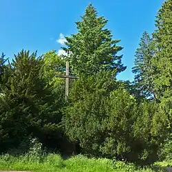 Am 8. Juli 1951[2] wurde auf Initiative von Forstamtsleiter Otto Korn[7] bei der Kreuzbuche eine Gedenkstätte für im Zweiten Weltkrieg gefallene Beschäftigte der Forstverwaltung eingeweiht. Das aus Spenden der Mitarbeiter des Forstamts finanzierte Denkmal besteht aus einem 2,50 Meter hohen Gedenkstein und einem 12 Meter hohes Holzkreuz, das aus einem 15 Meter langen und damals 344 Deutsche Mark teuren Eichenstamm gefertigt wurde.[2]