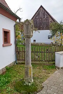 Der 224 cm hohe Kreuzhausbildstock besteht aus grauem Sandstein und entstand im Jahr 1664.