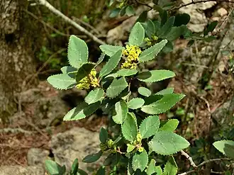 - ↑ Elbert L. Little: Minor Western Hardwoods (= Atlas of United States Trees. Band 3). US Government Printing Office, 1976, Map 150-SW, Rhamnus crocea, hollyleaf buckthorn.