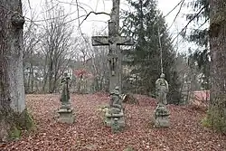 Die aus Sandstein angefertigte Kreuzigungsgruppe mit ihren annähernd lebensgroßen Figuren ist im Landkreis Kronach einmalig. Die drei Figurengruppen ruhen auf konkav-konvex geformten quadratischen Sockeln, von denen der mittlere an seiner Südseite die folgende Inschrift trägt: „Johann Grebner Hoffbauer v. Güffdig 1765“. Auf dem Sockel steht ein 3,25 Meter hohes Kreuz, an dem mit drei geschmiedeten Nägeln ein 130 Zentimeter großer Korpus befestigt ist. Am Kreuzkopf über dem Korpus befindet sich in Reliefform eine Schriftrolle mit der Buchstabenfolge „INRI“, am Fuß des Kreuzes kniet die Figur der Maria Magdalena. Auf dem Sockel links des Kreuzes steht Maria, die Mutter Jesu, auf dem rechten der Apostel Johannes. Beide Figuren sind ebenfalls je 130 Zentimeter hoch.
